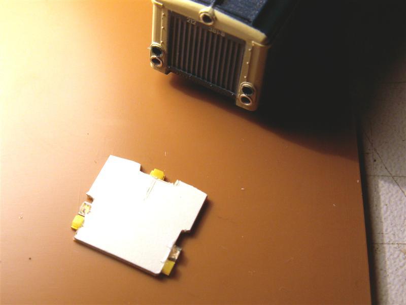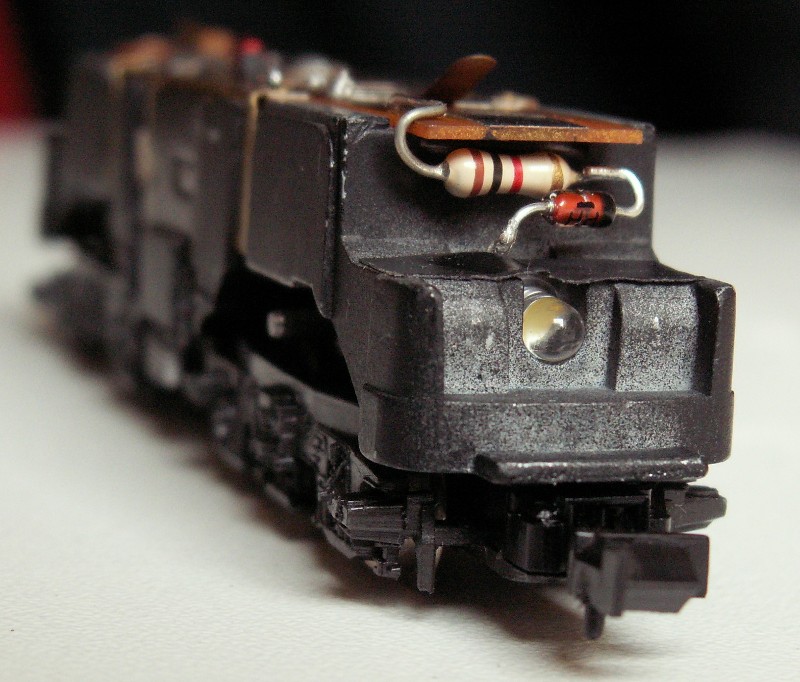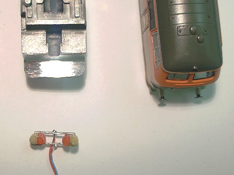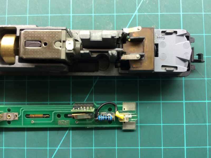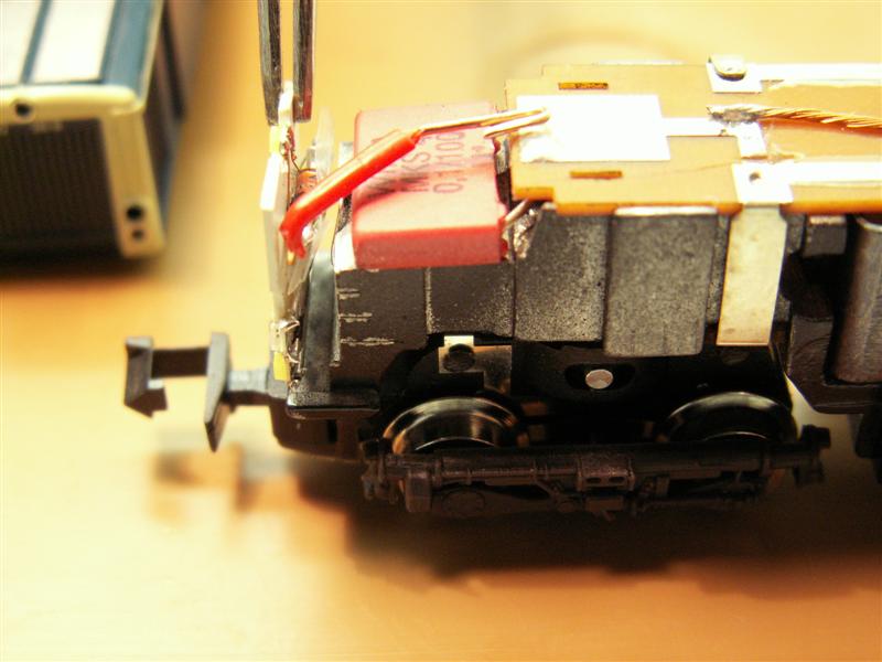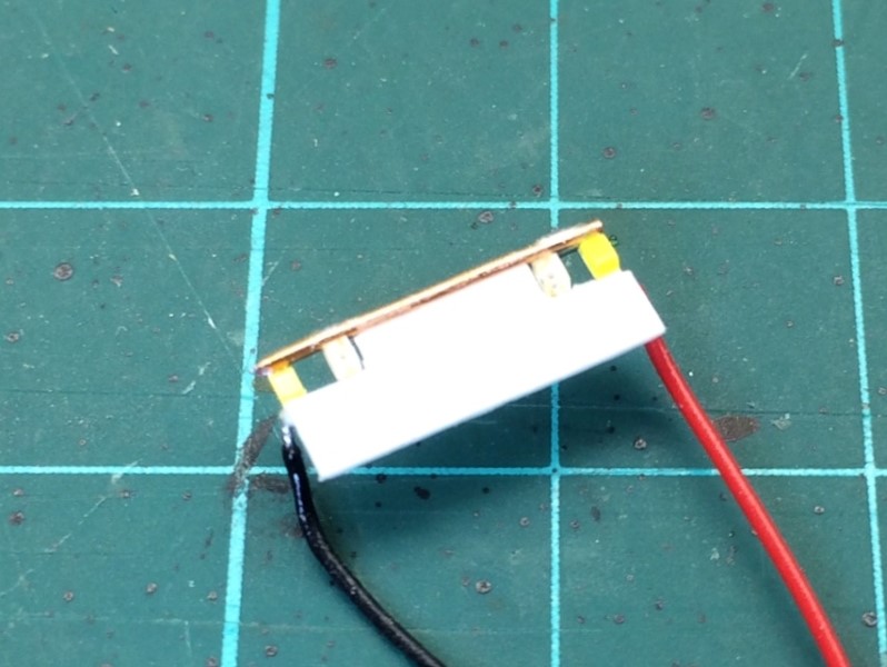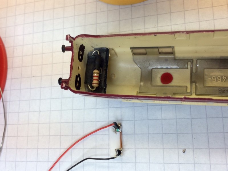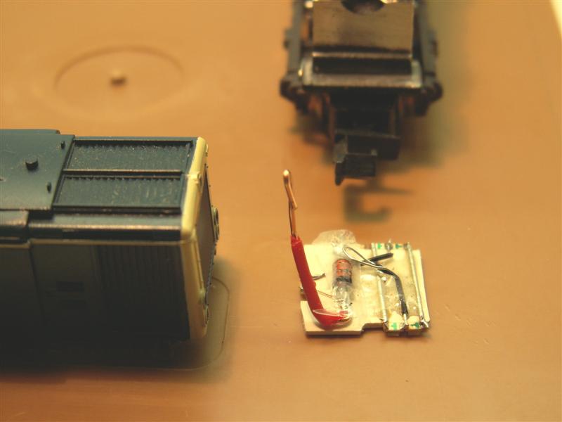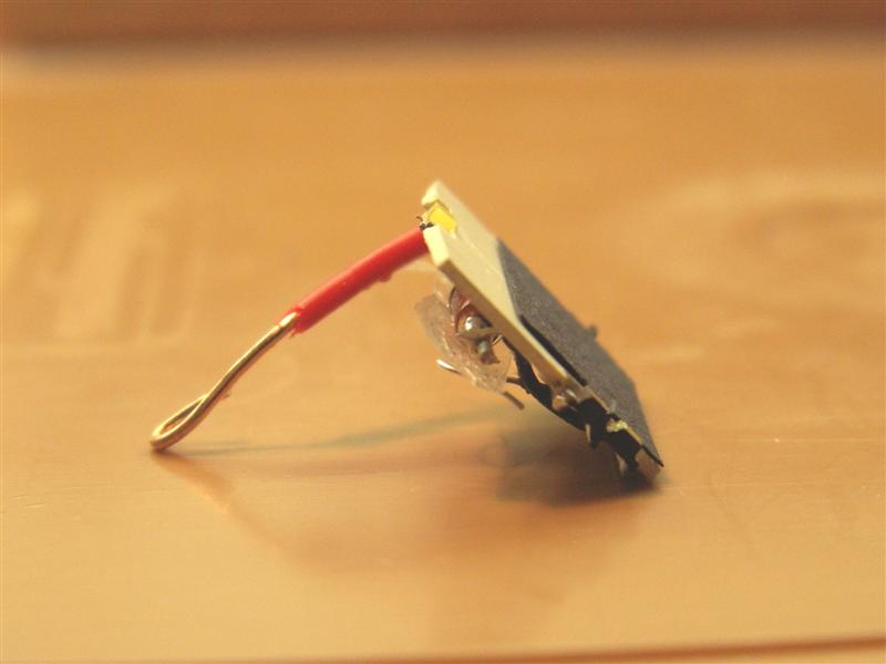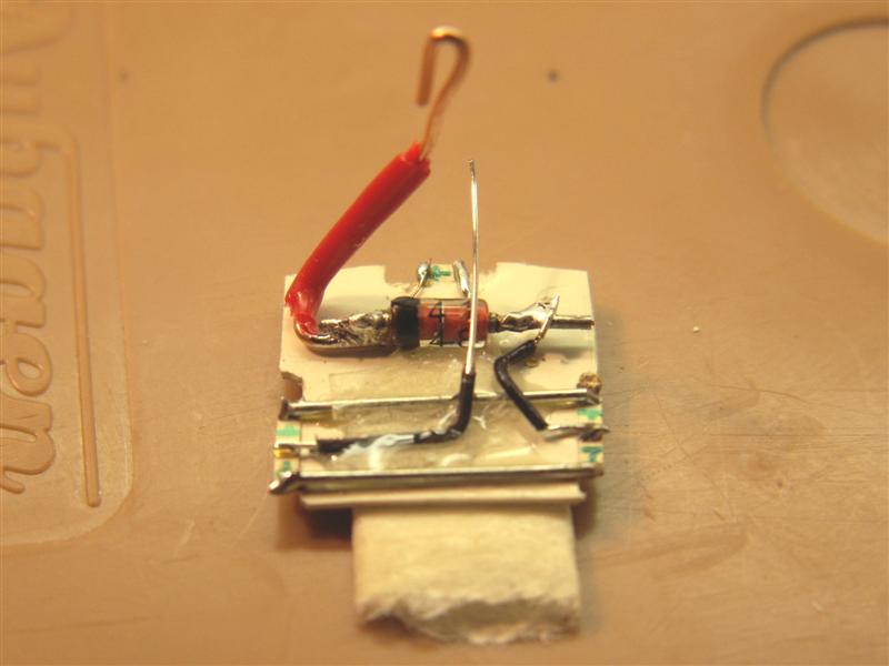 Tevens worden twee draadjes aangesloten, en hier wordt de derde gele led aan bevestigd. Deze led is aan beide zijen plat gevijld om straks goed achter de lichtopening in de kap van de loc te passen.