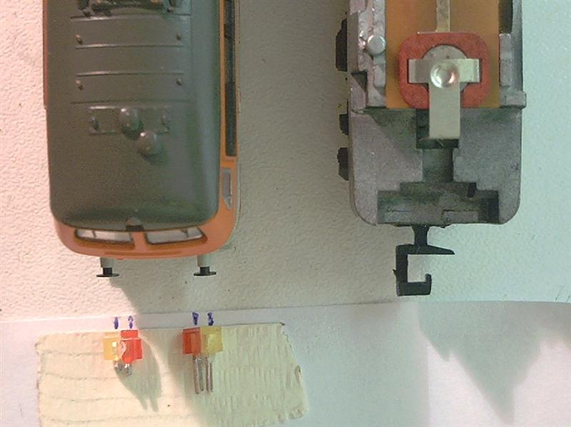 Echter, deze seinen werken met lampjes, en daar kleven nadelen aan. Verder heb ik het betreffende treinstel ooit tweedehands gekocht, en de vorige eigenaar is er niet zo netjes mee omgesprongen: de lichtgeleider naar het derde licht in het dak ontbrak.