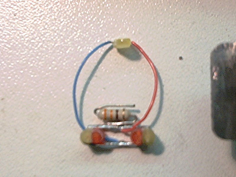 Aan de weerstand wordt een stukje extra draad gemaakt, dat straks contact moet gaan maken op de printplaat bovenop het chassis. De diode die hier zat wordt verwijderd en er blijft zo een mooi contactvlak over.
