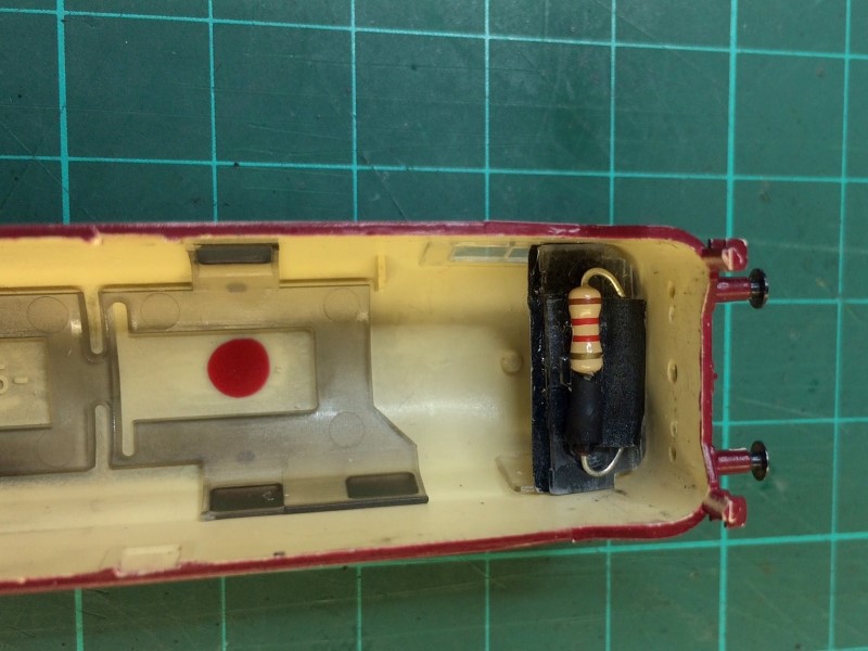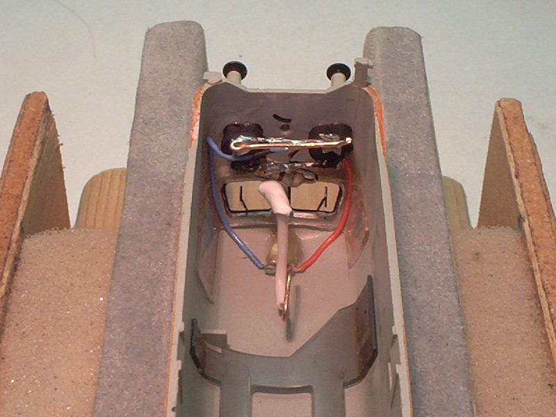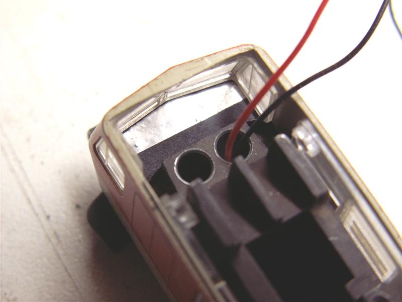 Nu wordt de lichtgeleider weer op z'n plek in de kap gezet, de draden worden door een van de gaten waar vroeger de lampjes in zaten geleid, en het hele onderstel van het treinstel kan weer in elkaar worden gezet.