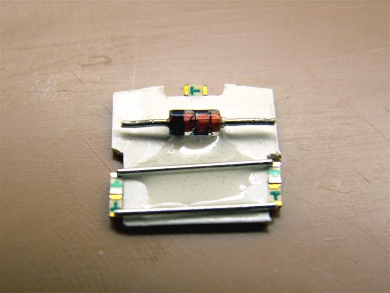 Als de ledjes zijn gemonteerd, wordt op de achterkant van het frame met 2-componentenlijm de diode en wat 'draadbruggen' gelijmd. Vervolgens worden deze aan de leds en diode vastgesoldeerd.