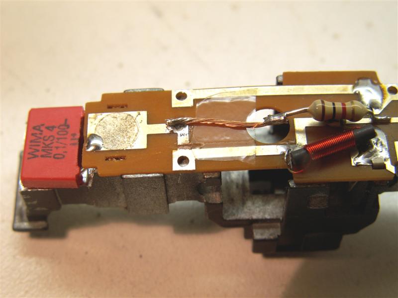 Deze condensator is nodig omdat bij het HCCM blokgestuurde systeem dat ik gebruik (pulsbreedte modulatie) er kennelijk naast de rijspanning met de ene polariteit ook nog kleine pulsjes met de tegengestelde polariteit optreden. Met een gewoon lampje als verlichting valt dit nooit op, maar de leds reageren hier wel op.
