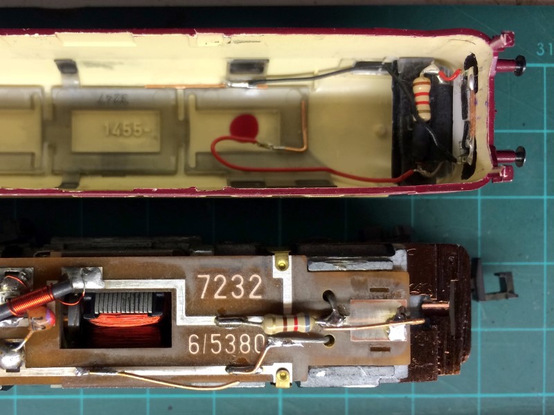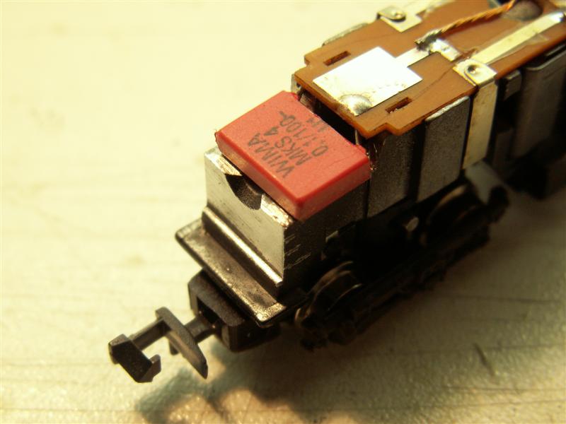 Zonder deze condensator zou bij vooruitrijden naast de frontseinen ook de sluitseinen nog een beetje oplichten. En da's natuurlijk niet fraai. Door de condensator vallen deze piekjes met 'verkeerde polariteit' gewoon weg.