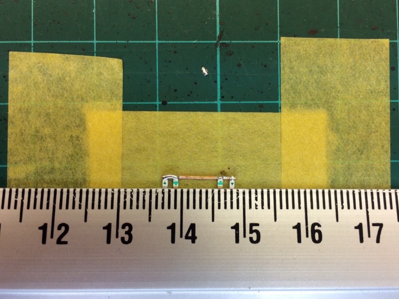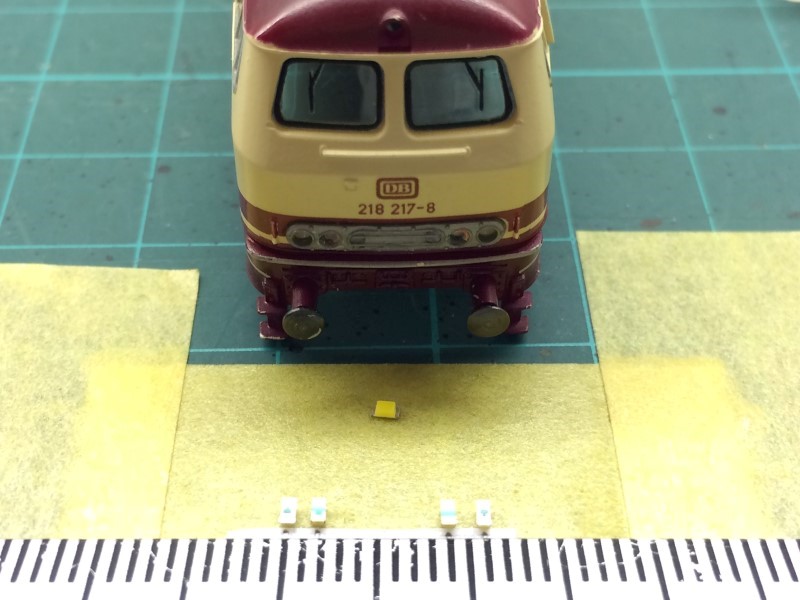 De gele en rode led moeten omgepoold met elkaar worden verbonden, en de hartafstand moet kloppen met de hartafstand van de lichten in de kap van de loc. Daarom worden ook de betreffende zijkanten van de leds platgevijld.