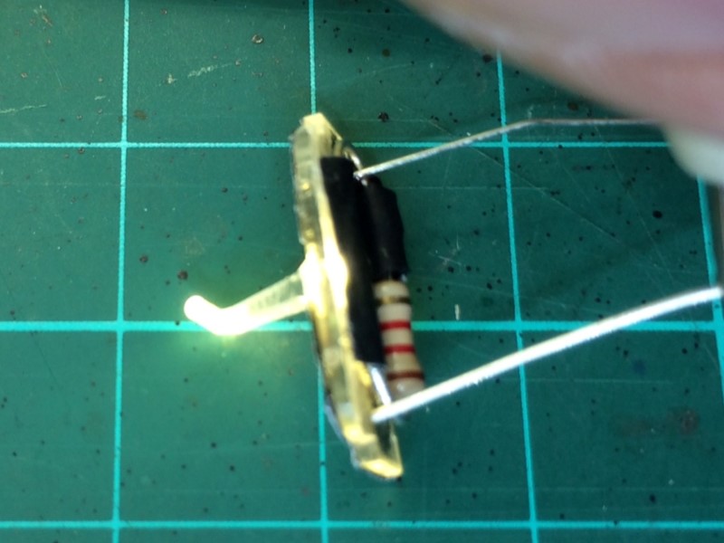 Op onderstaande foto is het resultaat te zien. (De foto is gemaakt voordat de diode en serieweerstand zwart zijn geverfd.)