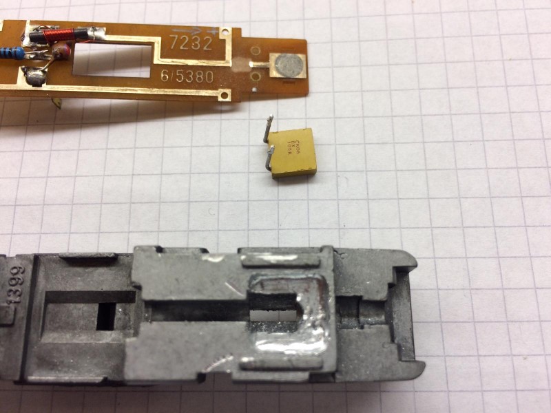 Om ook de condensator kwijt te kunnen moet er een stukje uit het frame worden gezaagd. In het contactvlak wordt een gaatje geboord, en hierdoor wordt een pootje van de condensator vastgesoldeerd.