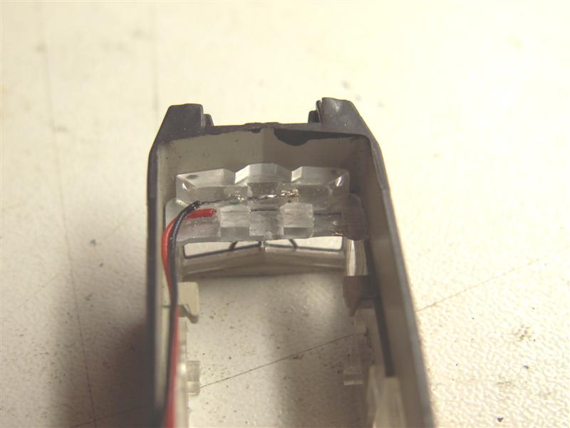 Om de loc van sluitlichten te voorzien zit de standaard lichtgeleider voor de frontseinen in de weg. Dus deze wordt er als eerste uitgehaald.