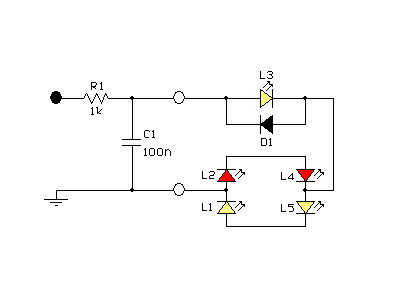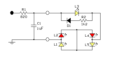De ledjes zitten vervolgens aangesloten over deze condensator: alle witte (L1, L3 en L5) in serie, en de rode (L2 en L4) in serie met diode D1.