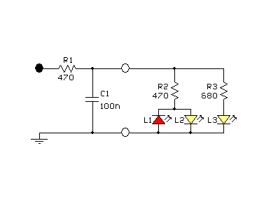 De stroom door de ledjes wordt gereduceerd middels weerstanden. Allereerst door R1, die op de rijspanning is aangesloten.